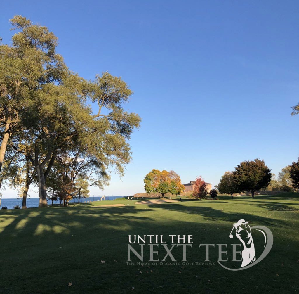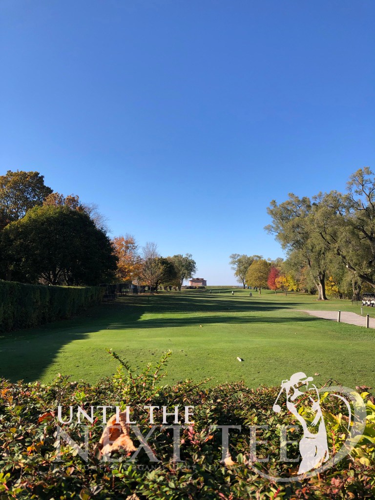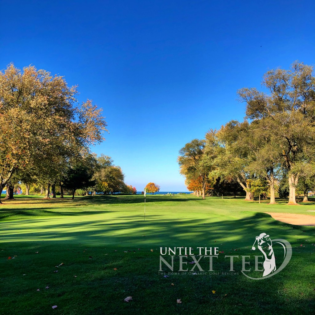 The third and fifth holes at NOTL Golf Club are both Par-5 holes that offers tight tree-lined fairways. a street down the left side respectfully depending on which of the two holes that you’re playing. So control is important here. I failed to find the fairway either time finding a fairway bunker on the 3rd hole and the trees on the 5th hole. Having duffed my attempt out of an easy fairway bunker on the 3rd hole, I found the back of the green with a rescue club. Meanwhile, on the 5th hole I was in tree trouble down the right side. The third fairway which runs adjacent to the 5th hole was void of golfers, so I elected to play up the third fairway. I saved par here. The greens for both of these Par-5 holes feature great bunkering. Standing on the tee of the 5th hole, you can see the imposing Fort Niagara off in the distance.