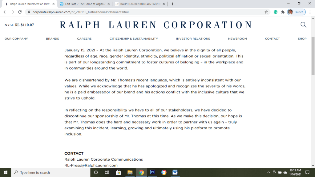“…our hope is that Mr. Thomas does the hard and necessary work in order to partner with us again”. This part of the statement tells me that Ralph Lauren has not totally slammed the door shut. It seems that if both parties are in agreement, they could reconcile down the road. Thus, this is why I say that the partnership has been suspended even though “discontinued” has been used.