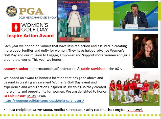 (WEST PALM BEACH, Fla., 2/4/2021 ) Women’s Golf Day (WGD) has announced this year’s winners of the WGD Inspire Action Awards. Congratulations to Jackie Davidson, Assistant Director of Golf Development at The R&A and Antony Scanlon, Executive Director of the International Golf Federation (IGF), and La Cala Resort. The Awards, which are in their 4th year, recognise those who have inspired action and created opportunity for women in golf.