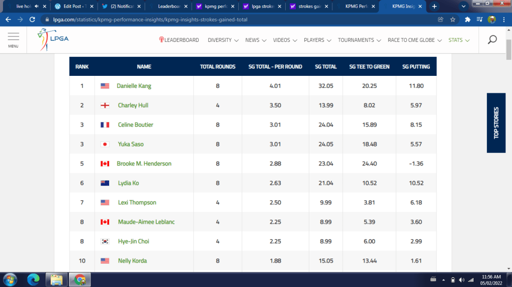 Putting is even more important though if you think about it from this standpoint. Let’s look at Brooke Henderson. Brooke Henderson who is at the time of writing in 20th place at -6 has left strokes out on the golf course. Where? On the green. According to stats from KPMG Performance Insights, a stat that I heard during the telecast on LPGA.com (I am looking to fact check it) stated that Brooke Henderson was dead last in Strokes Gained Putting this week. Poor putting as we all know can derail a round. Imagine if Henderson’s -1.36 was a shade better at last week’s Gainbridge LPGA. She could have won. I haven’t see her numbers yet for the 2022 Drive On Championship, but, I’m willing to contend that they’re worse this week.