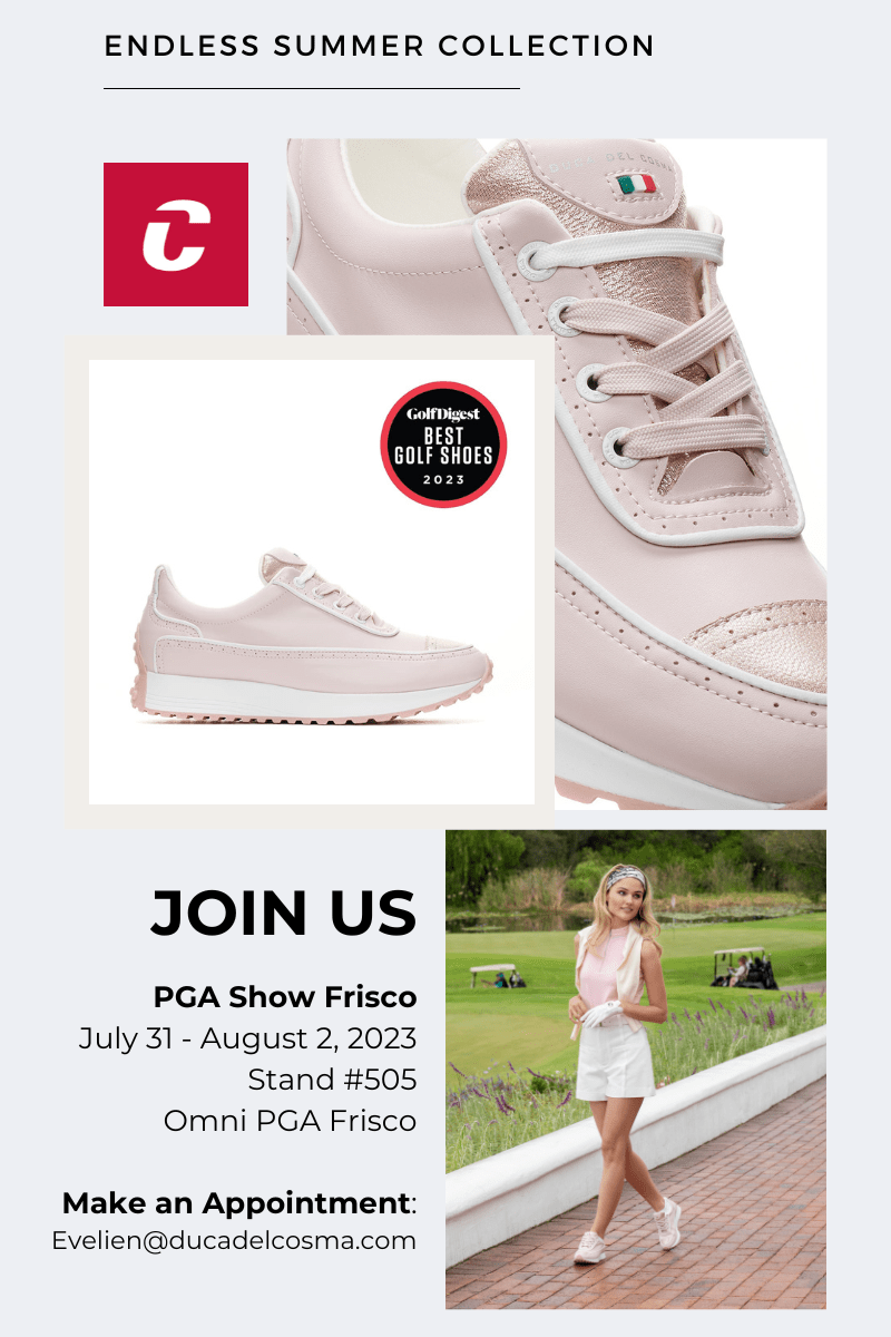NORTH PALM BEACH, FL. – JULY 25, 2023 – Award-winning Italian lifestyle brand, and golf shoe trendsetter, Duca del Cosma, is thrilled to announce the company will participate at the 2023 PGA Buying and Education Summit from July 31 – August 2 at the Omni PGA Frisco Resort at PGA Frisco, the new home of the PGA of America.