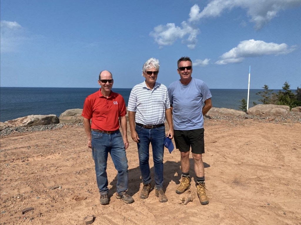 Acclaimed golf course architects Doug Carrick (left) and Tom McBroom (centre) with Steven Joyce (right), owner of Fox Harb’r Resort, standing on a future fairway.