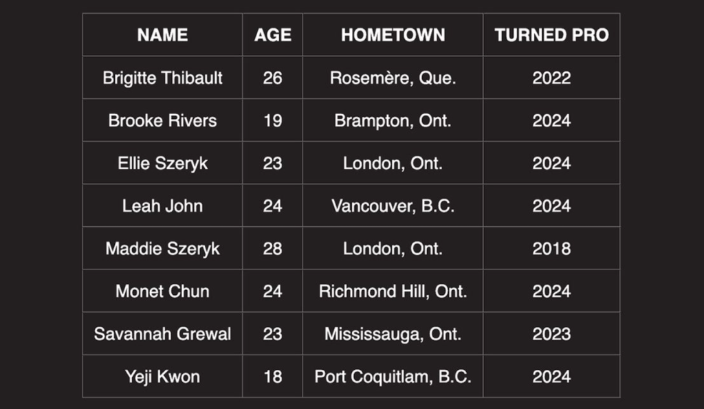 The women’s professional team features eight returning players including: Brigitte Thibault, Brooke Rivers, Ellie Szeryk, Leah John, Maddie Szeryk, Monet Chun, Savannah Grewal and Yeji Kwon. Also joining the pro group this season is Anna Huang who announced her decision to turn pro last month. Huang will remain on the Team Canada – NextGen squad this season.