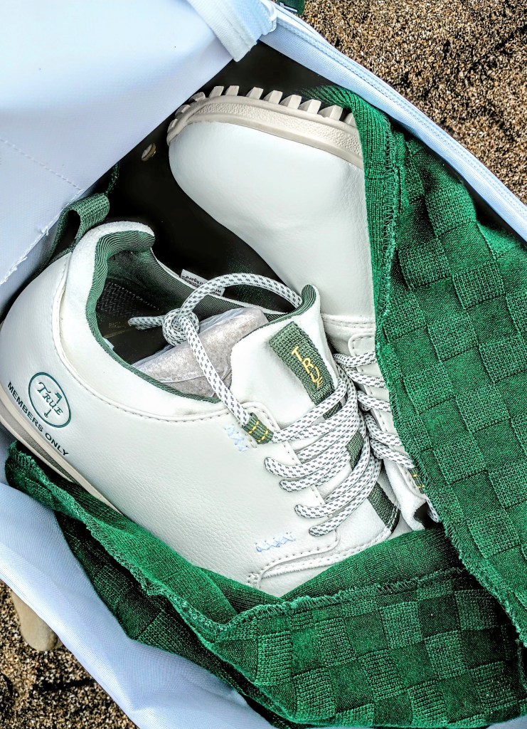 - A “Members Only” Collection box from True Linkswear with Masters-themed products like shoes, a towel, and a headcover